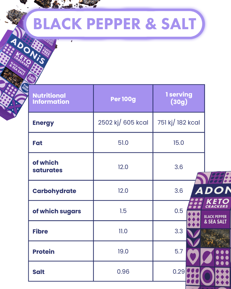 Our Black Pepper & Sea Salt Keto Crackers are made from a blend of nutrient-dense seeds and baked to achieve a savoury, crunchy texture. The seasoning of black pepper and natural sea salt adds a bold, satisfying flavour while delivering essential minerals. Packed with fibre and healthy fats, these crackers support steady energy and long-lasting satiety, all with an ultra-low carb profile. Free from artificial additives and crafted from purely organic ingredients, they are a perfect on-the-go snack or low-carb base for your favourite toppings.
